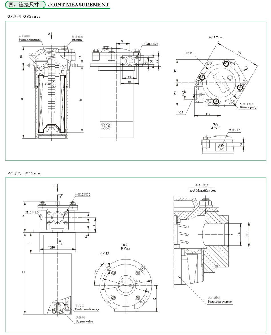 WY磁性過濾器僅一小部分的濾頭連接部分露在油箱外,其余大部分都在油箱內部,從而簡化了系統管路,安裝方便,系統排列緊湊美觀。在結構上我們改進了原來管路回油過濾器的龐大結構,